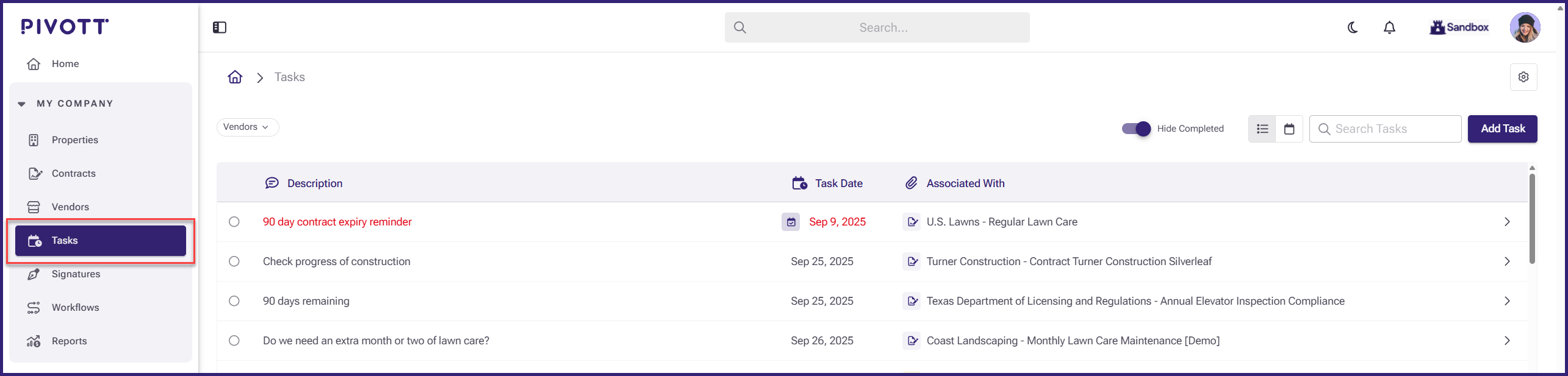 Pivott’s Tasks feature helps your team manage key dates and to-dos for vendors, properties, and contracts. Get reminders by email or in-app notifications, mark tasks complete, see who completed them, and track everything in a calendar view.