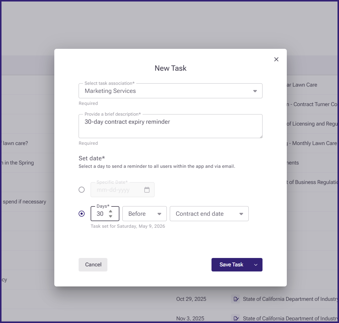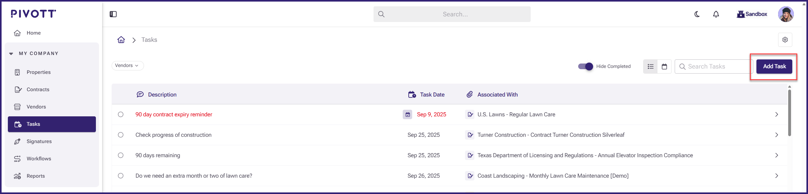 - Applies across all task locations — Vendors, Properties, and Contracts.