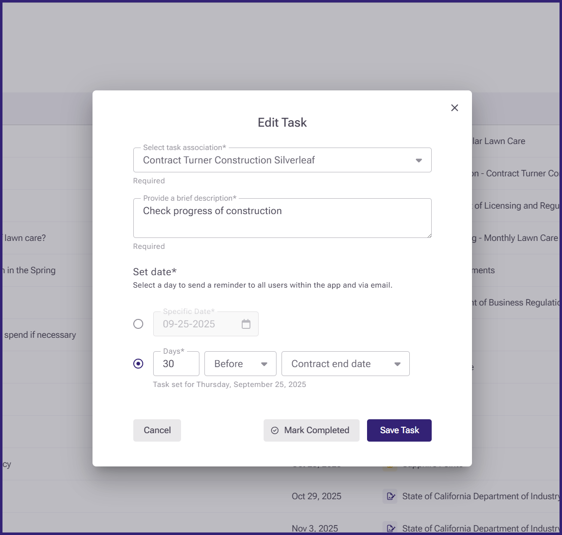 - You can search for and select a Property, Vendor, or Contract to associate with the task.