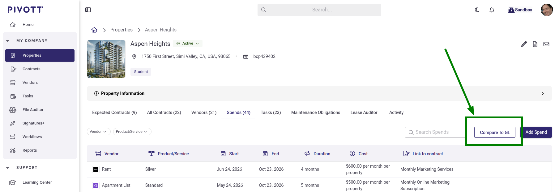 Visit the "Spend" tab of any property and click "Compare to GL" to get started.