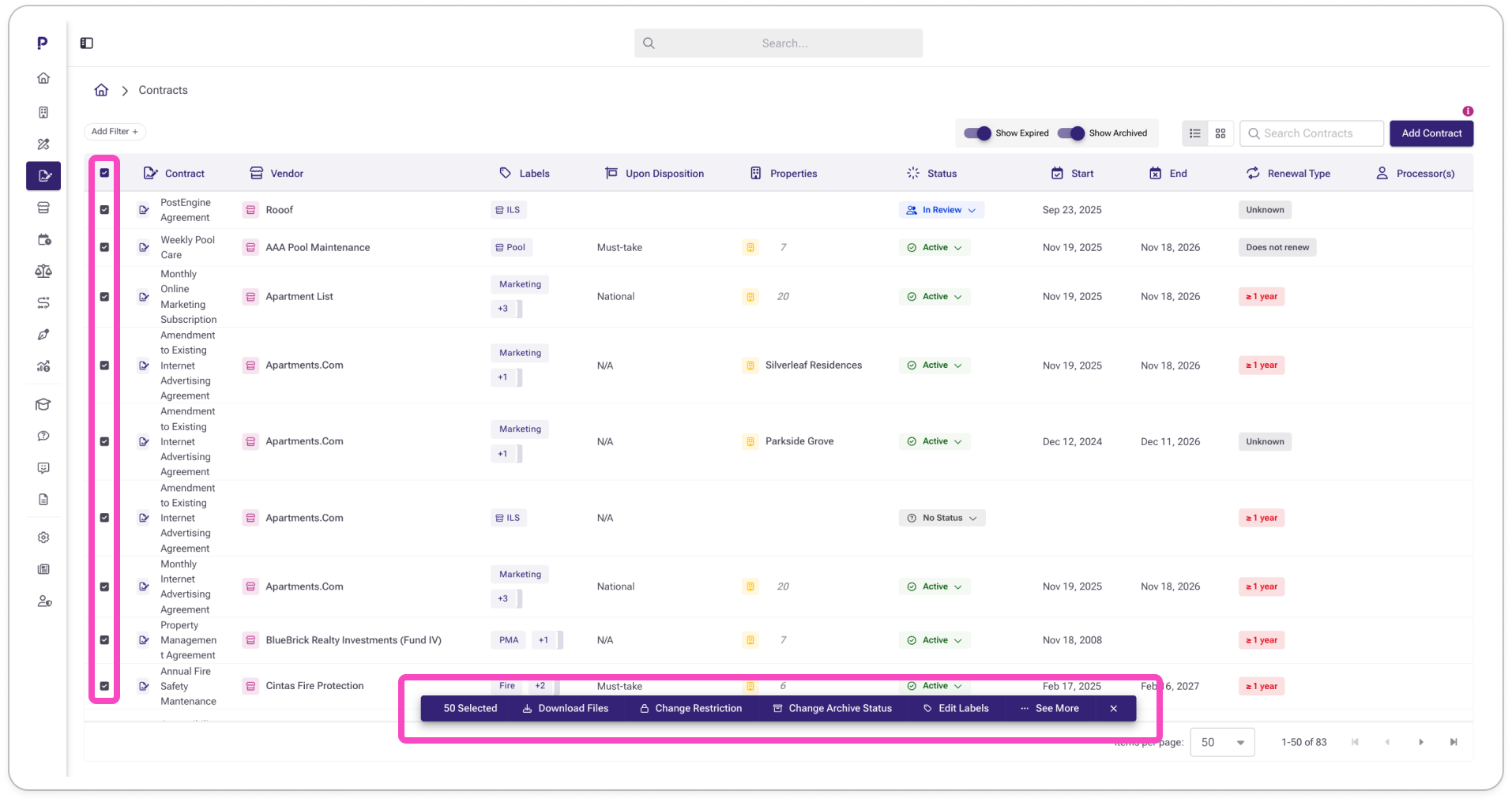 - Change Archive Status – Archive or unarchive the selected contracts (if your organization uses archiving).