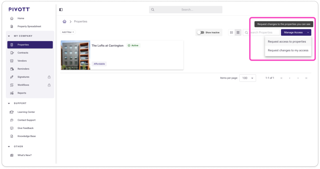 | What it does | Opens a menu: “Request access to properties” or “Request changes to my access,” then opens a prefilled support message. |