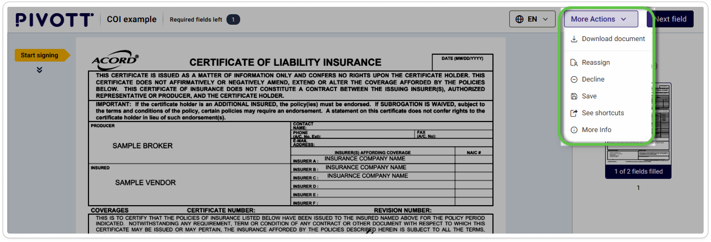 | Download Document | This will download a PDF, including all fields filled by other parties. |